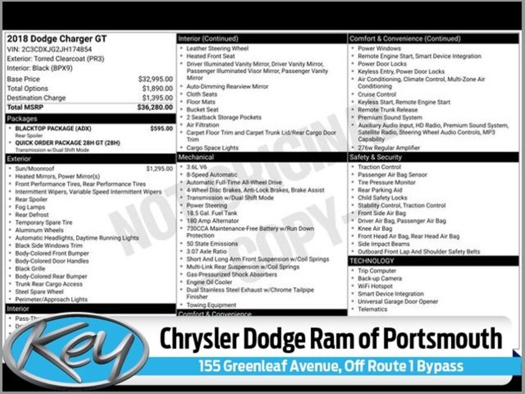 Key Chrysler Dodge Ram of Portsmouth is proud to present you with another True Market Priced Pre-Owned Vehicle. Transparent Pricing Of $ !! This 2018 Dodge Charger GT is loaded with the following Factory Options: AWD and Black Cloth Blacktop Package (Black 1-Piece Performance Spoiler, Dark Brushed II Interior Accents, Delete Badge, Dodge Grille Badge, Gloss Black Fascia Applique, Gloss Black I/P Cluster Trim Rings, Performance Steering Wheel, and Satin Black Charger Decklid Badge), Quick Order Package 28H GT (300 HP Power Rating, R/T Front End Appearance, Sport Mode, and Steering Wheel Mounted Shift Control), AWD, Black Cloth, 4-Wheel Disc Brakes, 6 Speakers, ABS brakes, Air Conditioning, Alloy wheels, AM/FM radio: SiriusXM, Anti-whiplash front head restraints, Apple CarPlay/Android Auto, Auto-dimming Rear-View mirror, Automatic temperature control, Brake assist, Bumpers: body-color, Cloth Sport Seat, Compass, Delay-off headlights, Driver & Passenger Lower LED Lamps, Driver door bin, Driver vanity mirror, Dual front impact airbags, Dual front side impact airbags, Electronic Stability Control, Emergency communication system: SiriusXM Guardian, Four wheel independent suspension, Front anti-roll bar, Front Bucket Seats, Front Center Armrest, Front dual zone A/C, Front fog lights, Front reading lights, Fully automatic headlights, Garage door transmitter: HomeLink, Heated door mirrors, Heated Front Seats, Heated front seats, Illuminated entry, Knee airbag, Leather Shift Knob, Low tire pressure warning, Occupant sensing airbag, Outside temperature display, Overhead airbag, Overhead console, Panic alarm, ParkView Rear Back-Up Camera, Passenger door bin, Passenger vanity mirror, Power 4-Way Driver Lumbar Adjust, Power 8-Way Driver Seat, Power door mirrors, Power driver seat, Power steering, Power Sunroof, Power windows, Radio data system, Radio: Uconnect 4C w/8.4" Display, Rear anti-roll bar, Rear Armrest w/Cupholder Seat, Rear reading lights, Rear seat center armrest, Rear window defroster, Remote keyless entry, Speed control, Speed-Sensitive Wipers, Split folding rear seat, Spoiler, Steering wheel mounted audio controls, Tachometer, Telescoping steering wheel, Tilt steering wheel, Traction control, Trip computer, Variably intermittent wipers, and Wheels: 19" x 7.5" Painted Granite Crystal!!