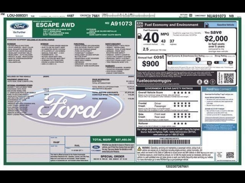 2022 Ford Escape SE Hybrid Iced Blue Silver Metallic 4D Sport Utility SE Hybrid 2.5L iVCT eCVT AWD