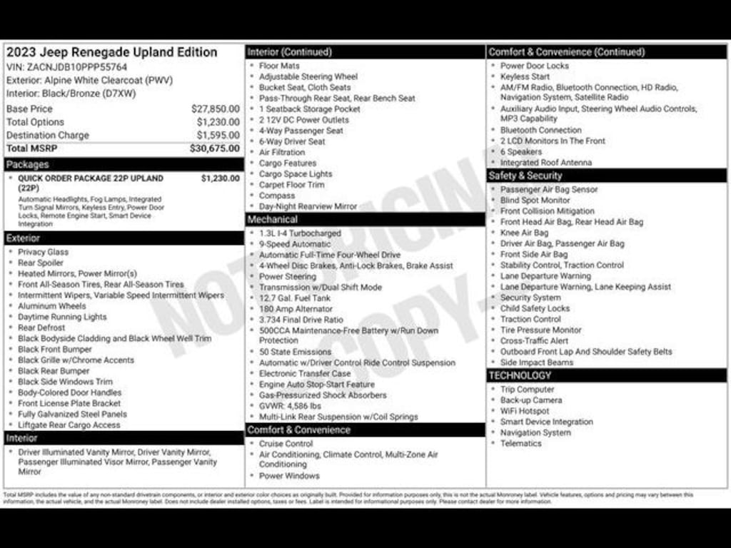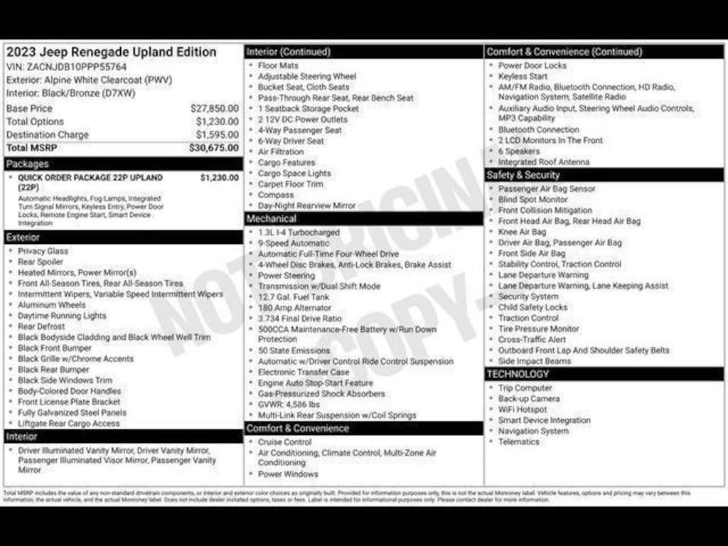 Key Chrysler Dodge Jeep Ram of Rochester is proud to present you with another True Market Priced Pre-Owned Vehicle. Transparent Pricing Of $ 20794 !! This 2023 Jeep Renegade Latitude Upland Edition is loaded with the following Factory Options: ABS brakes, Alloy wheels, Compass, Electronic Stability Control, Front dual zone A/C, Heated door mirrors, Illuminated entry, Low tire pressure warning, Navigation System, ParkView Rear Back-Up Camera, Remote keyless entry, and Traction control ABS brakes, Alloy wheels, Compass, Electronic Stability Control, Front dual zone A/C, Heated door mirrors, Illuminated entry, Low tire pressure warning, Navigation System, ParkView Rear Back-Up Camera, Remote keyless entry, Traction control, 17" x 7.0" Aluminum Wheels, 3.734 Final Drive Ratio, 4-Wheel Disc Brakes, 6 Speakers, Air Conditioning, AM/FM radio: SiriusXM, Anti-whiplash front head restraints, Apple CarPlay/Android Auto, Automatic temperature control, Brake assist, Cloth Bucket Seats, Delay-off headlights, Driver door bin, Driver vanity mirror, Dual front impact airbags, Dual front side impact airbags, Emergency communication system: SiriusXM Guardian, Four wheel independent suspension, Front anti-roll bar, Front Bucket Seats, Front Center Armrest, Front reading lights, Knee airbag, Normal Duty Suspension, Occupant sensing airbag, Outside temperature display, Overhead airbag, Passenger door bin, Passenger vanity mirror, Power door mirrors, Power steering, Power windows, Radio data system, Radio: Uconnect 4C Nav w/8.4" Display, Rear anti-roll bar, Rear window defroster, Rear window wiper, Roof rack: rails only, Security system, Speed control, Split folding rear seat, Spoiler, Steering wheel mounted audio controls, Tachometer, Telescoping steering wheel, Tilt steering wheel, Trip computer, Variably intermittent wipers, and Voltmeter!!